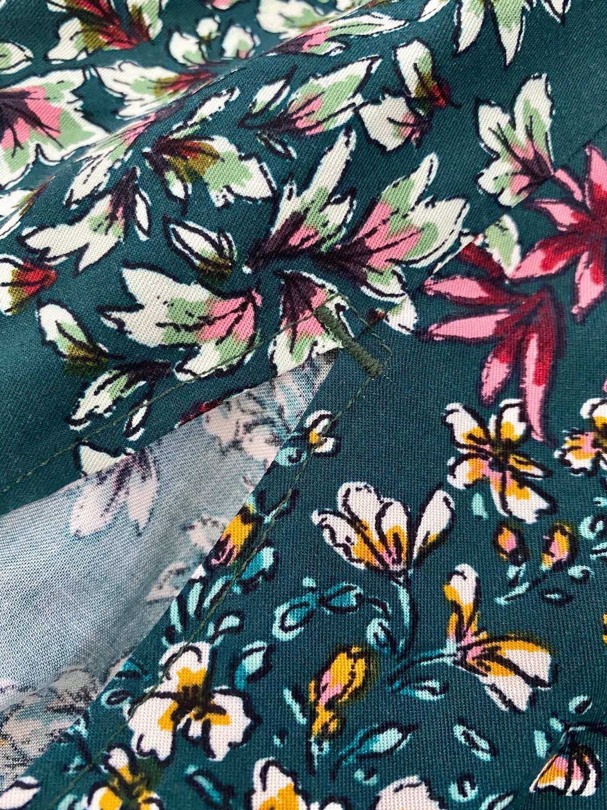 I had initially thought I wouldn't want a floral but I feel in love with the deep, rich colours of this print when I spotted it on the shelf. Unfortunately I can't see it on their website so it must have sold out. It is a viscose twill and what is particularly nice about it is the weight and opacity. I'm always a little hesitant about buying rayon or viscose online as some (particularly crepes) can be really quite flimsy and sheer. I prefer a bit of body to my viscose and think some weight really adds to the beautiful movement. It was so nice to be able to look at this one in person at the show. It a joy to sew with this fabric and it is even more delightful to wear. It is cool and smooth against the skin and swishes about dramatically. I machine washed it on a 30 degree gentle cycle and so far it hasn't faded or pilled at all and it presses really well with a medium iron. I used a microtex 70 needle to sew this and it moved through the machine without much shifting about. It is worth taking your time cutting viscose and making sure everything is laid out flat and on grain as it is easy to end up with some misshapen pattern pieces.